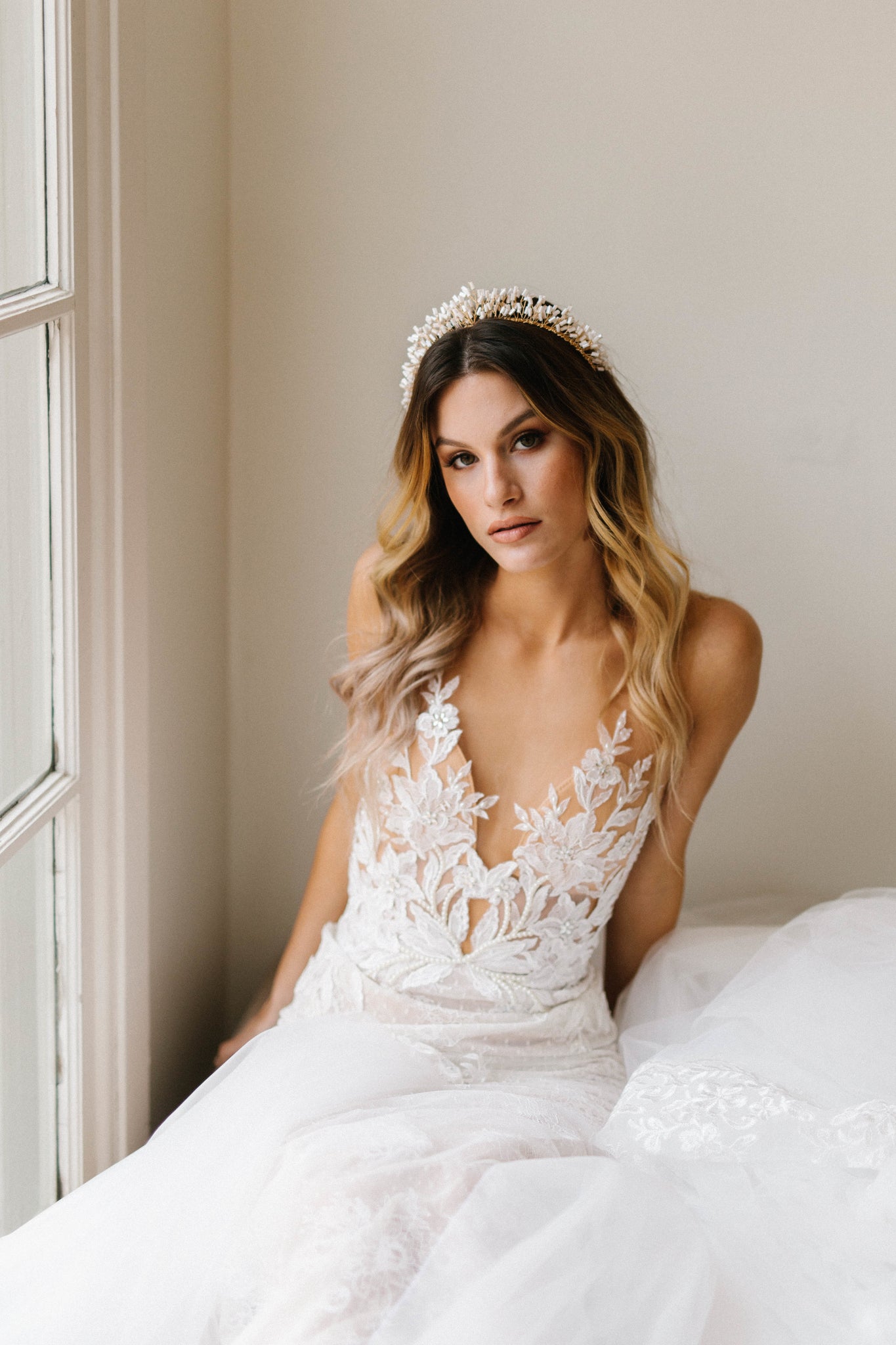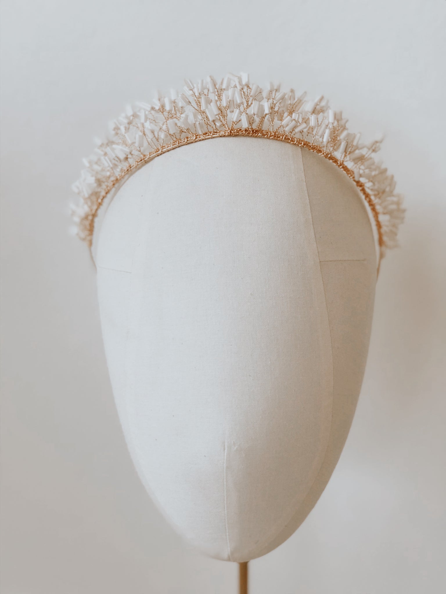 Gorgeous statement crown with white iridescent beading.