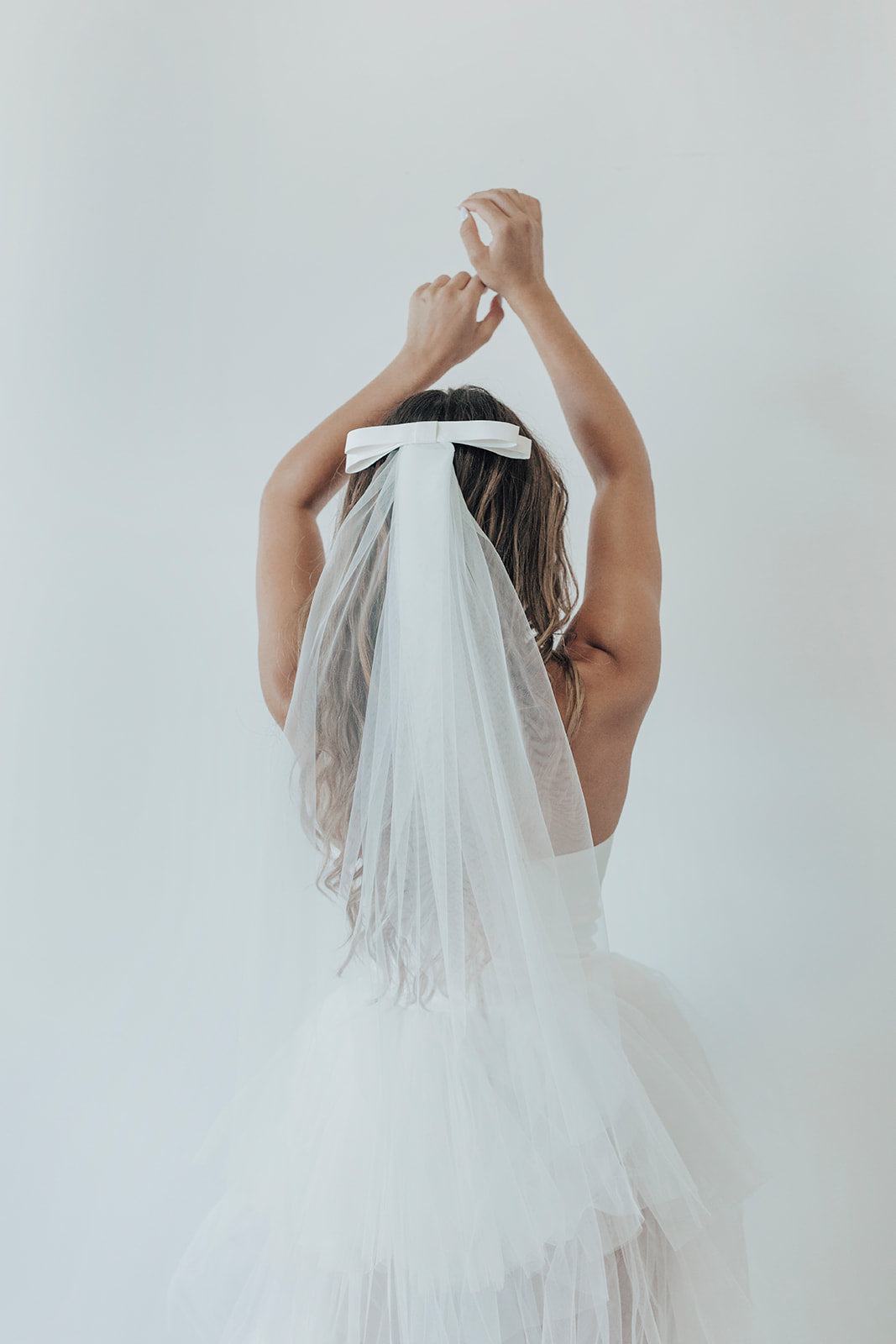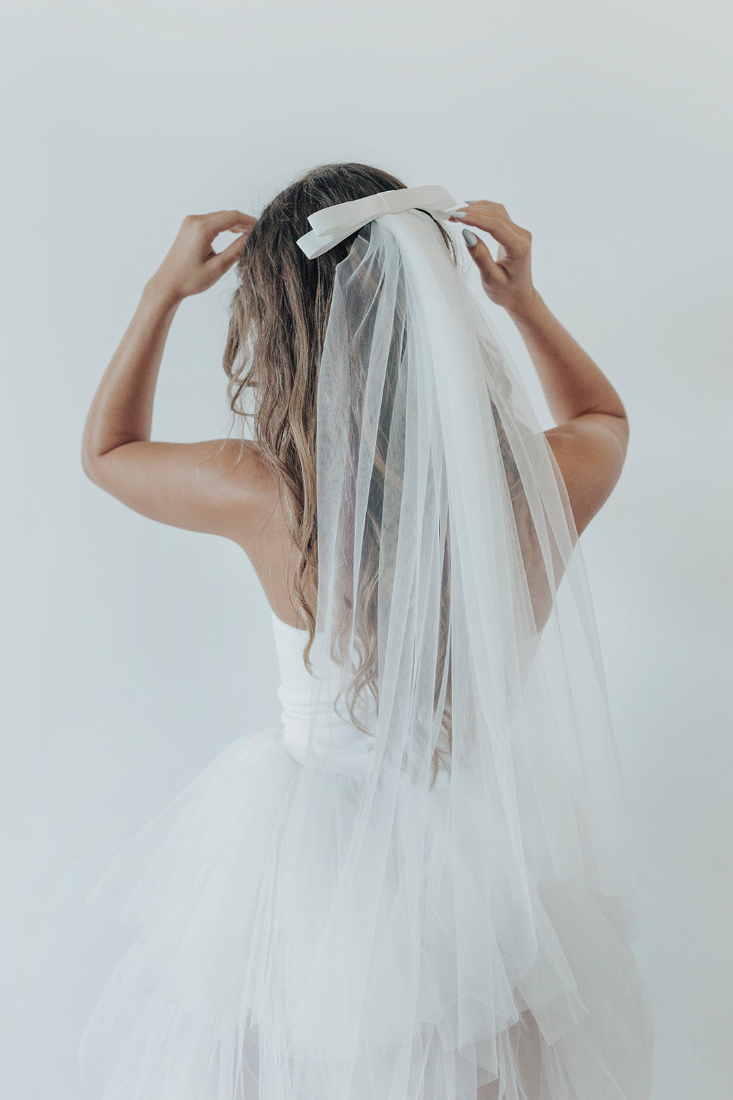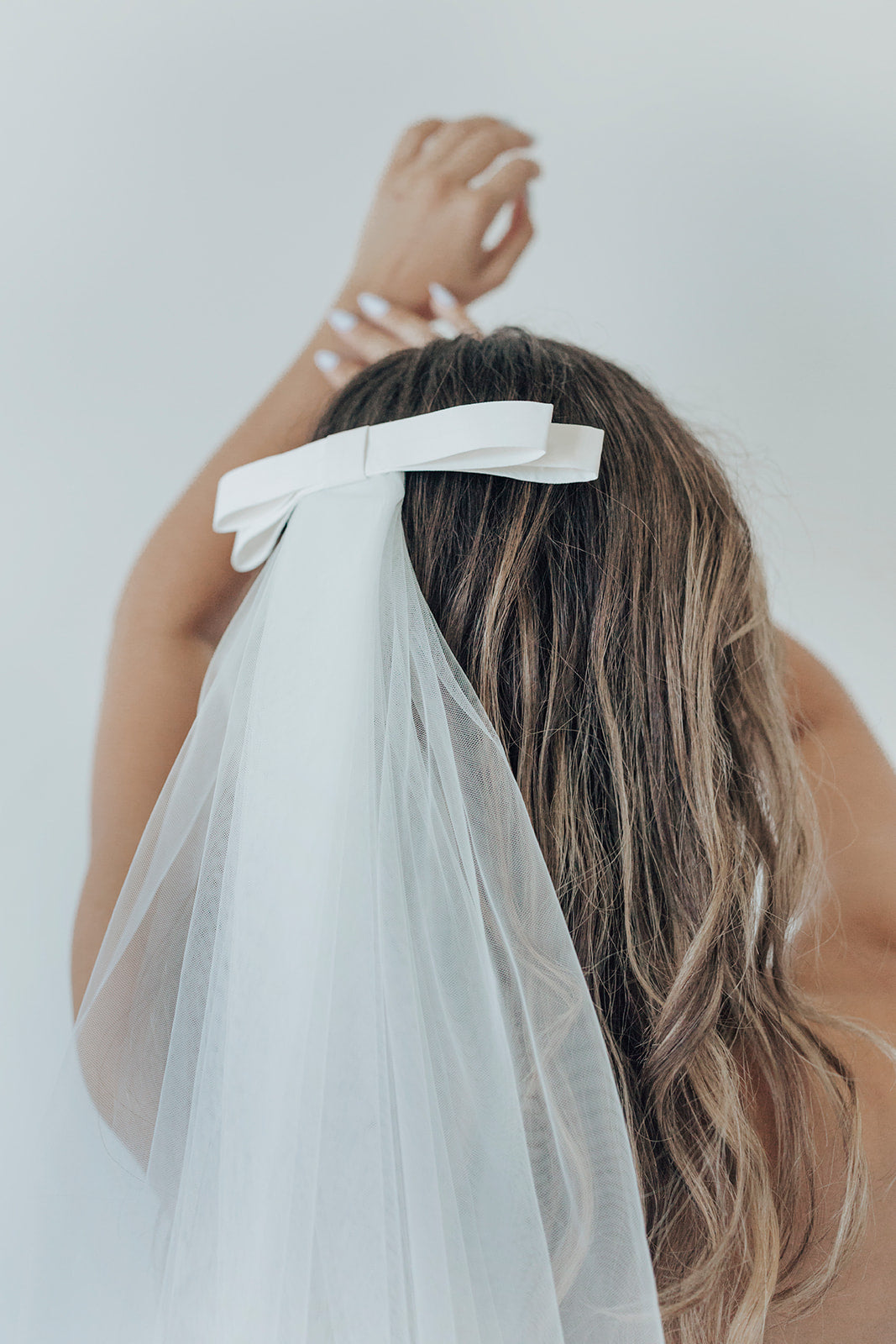 The sweetest bow veil. Includes a silver wire hair comb with bowknot.