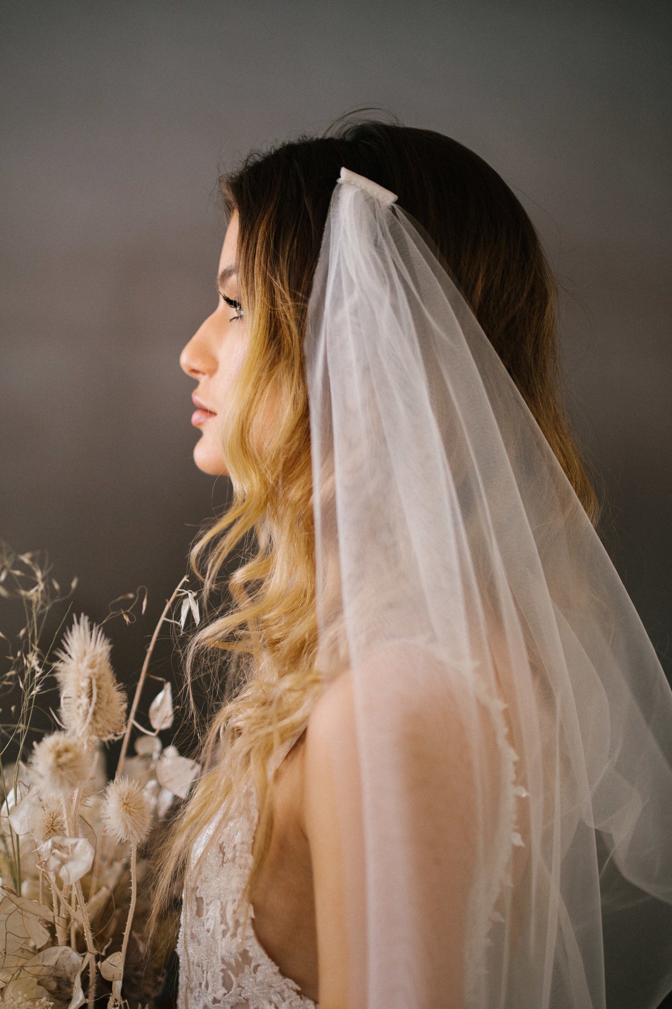 Cathedral length single tier veil with draping back.