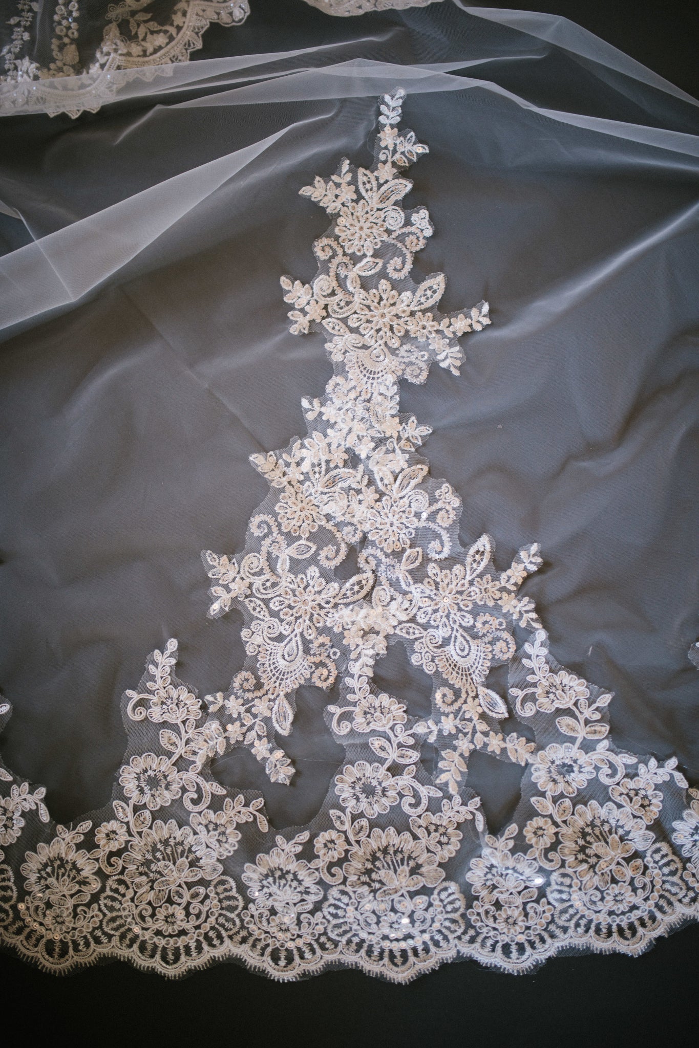 Cathedral length single tier veil with stunning statement embroidered lace edge with sequin detail.