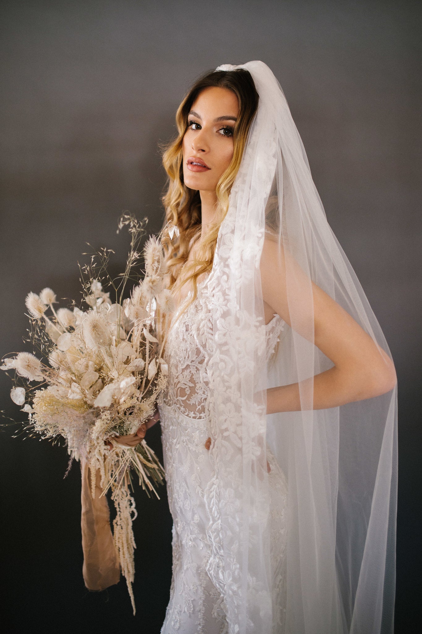 CathedralĀ length single tier veil with embroidered lace to the comb.Ā