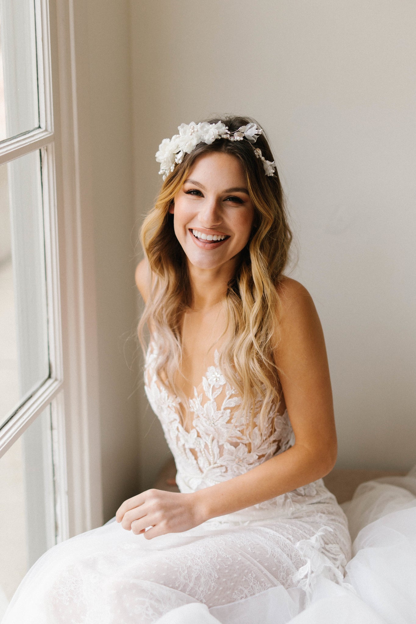 Organza Floral statement comb with silver leaves and small pearl accents.Â